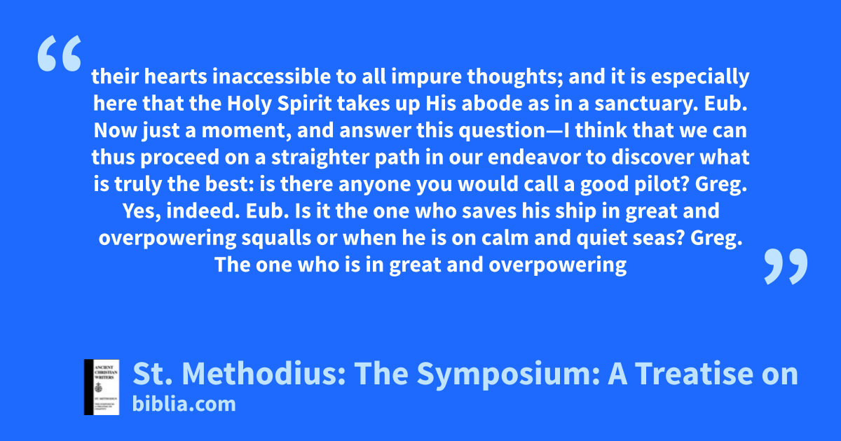 their hearts inaccessible to all impure thoughts; and it is especially here that the Holy Spirit takes up His abode as in a sanctuary. Eub. Now just a moment, and answer this question—I think that we can thus proceed on a straighter path in our endeavor to discover what is truly the best: is there anyone you would call a good pilot? Greg. Yes, indeed. Eub. Is it the one who saves his ship in great and overpowering squalls or when he is on calm and quiet seas? Greg. The one who is in great and overpowering