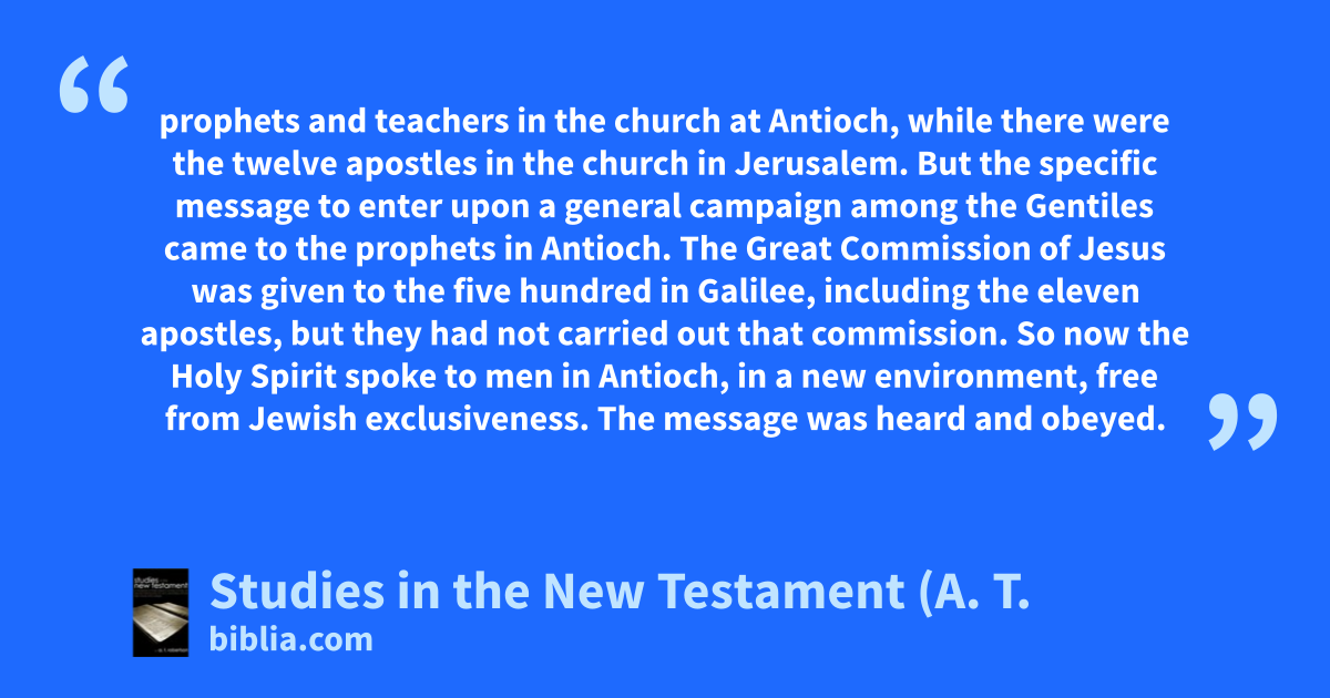 prophets and teachers in the church at Antioch, while there were the twelve apostles in the church in Jerusalem. But the specific message to enter upon a general campaign among the Gentiles came to the prophets in Antioch. The Great Commission of Jesus was given to the five hundred in Galilee, including the eleven apostles, but they had not carried out that commission. So now the Holy Spirit spoke to men in Antioch, in a new environment, free from Jewish exclusiveness. The message was heard and obeyed.