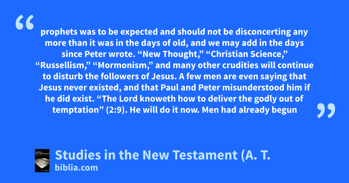 prophets was to be expected and should not be disconcerting any more than it was in the days of old, and we may add in the days since Peter wrote. “New Thought,” “Christian Science,” “Russellism,” “Mormonism,” and many other crudities will continue to disturb the followers of Jesus. A few men are even saying that Jesus never existed, and that Paul and Peter misunderstood him if he did exist. “The Lord knoweth how to deliver the godly out of temptation” (2:9). He will do it now. Men had already begun