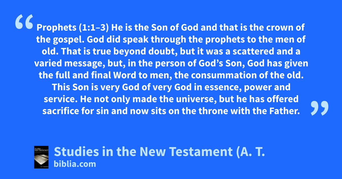 Prophets (1:1–3) He is the Son of God and that is the crown of the gospel. God did speak through the prophets to the men of old. That is true beyond doubt, but it was a scattered and a varied message, but, in the person of God’s Son, God has given the full and final Word to men, the consummation of the old. This Son is very God of very God in essence, power and service. He not only made the universe, but he has offered sacrifice for sin and now sits on the throne with the Father.