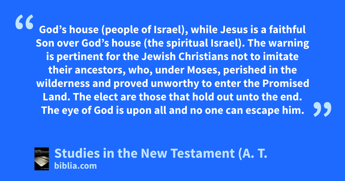 God’s house (people of Israel), while Jesus is a faithful Son over God’s house (the spiritual Israel). The warning is pertinent for the Jewish Christians not to imitate their ancestors, who, under Moses, perished in the wilderness and proved unworthy to enter the Promised Land. The elect are those that hold out unto the end. The eye of God is upon all and no one can escape him.