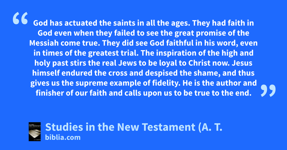 God has actuated the saints in all the ages. They had faith in God even when they failed to see the great promise of the Messiah come true. They did see God faithful in his word, even in times of the greatest trial. The inspiration of the high and holy past stirs the real Jews to be loyal to Christ now. Jesus himself endured the cross and despised the shame, and thus gives us the supreme example of fidelity. He is the author and finisher of our faith and calls upon us to be true to the end.