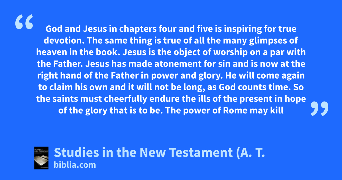 God and Jesus in chapters four and five is inspiring for true devotion. The same thing is true of all the many glimpses of heaven in the book. Jesus is the object of worship on a par with the Father. Jesus has made atonement for sin and is now at the right hand of the Father in power and glory. He will come again to claim his own and it will not be long, as God counts time. So the saints must cheerfully endure the ills of the present in hope of the glory that is to be. The power of Rome may kill