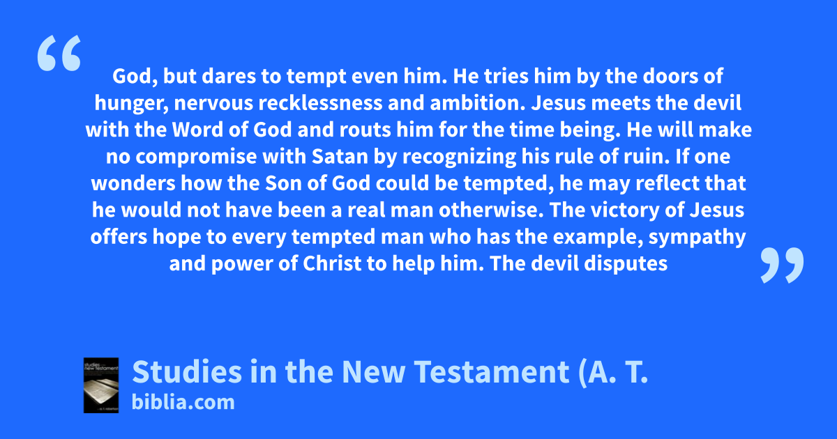 God, but dares to tempt even him. He tries him by the doors of hunger, nervous recklessness and ambition. Jesus meets the devil with the Word of God and routs him for the time being. He will make no compromise with Satan by recognizing his rule of ruin. If one wonders how the Son of God could be tempted, he may reflect that he would not have been a real man otherwise. The victory of Jesus offers hope to every tempted man who has the example, sympathy and power of Christ to help him. The devil disputes