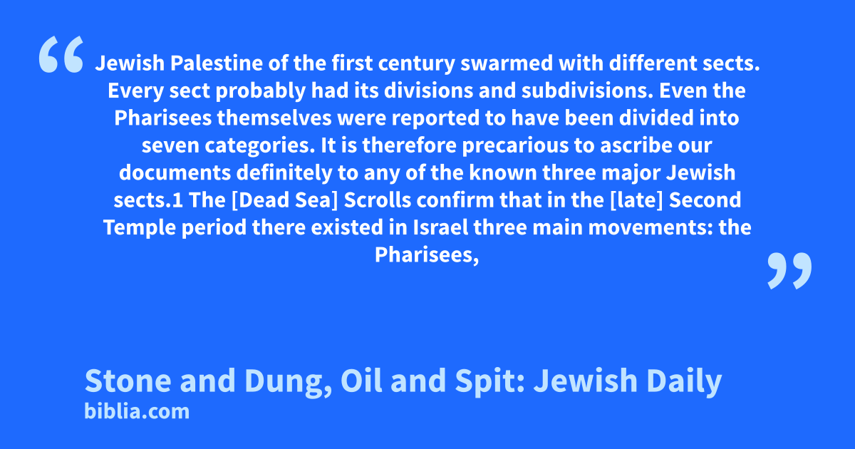 Jewish Palestine of the first century swarmed with different sects. Every sect probably had its divisions and subdivisions. Even the Pharisees themselves were reported to have been divided into seven categories. It is therefore precarious to ascribe our documents definitely to any of the known three major Jewish sects.1 The [Dead Sea] Scrolls confirm that in the [late] Second Temple period there existed in Israel three main movements: the Pharisees,