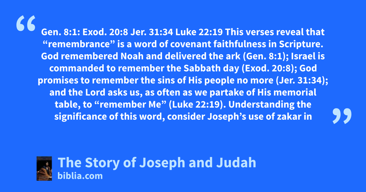 Gen. 8:1: Exod. 20:8 Jer. 31:34 Luke 22:19 This verses reveal that “remembrance” is a word of covenant faithfulness in Scripture. God remembered Noah and delivered the ark (Gen. 8:1); Israel is commanded to remember the Sabbath day (Exod. 20:8); God promises to remember the sins of His people no more (Jer. 31:34); and the Lord asks us, as often as we partake of His memorial table, to “remember Me” (Luke 22:19). Understanding the significance of this word, consider Joseph’s use of zakar in