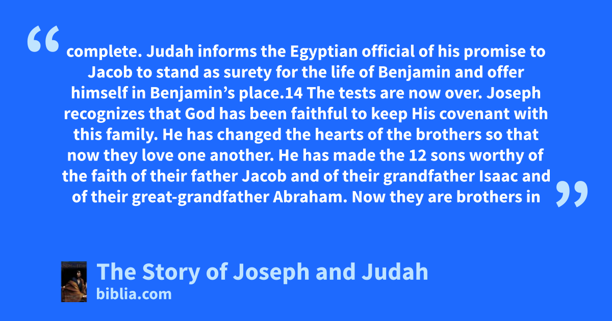 complete. Judah informs the Egyptian official of his promise to Jacob to stand as surety for the life of Benjamin and offer himself in Benjamin’s place.14 The tests are now over. Joseph recognizes that God has been faithful to keep His covenant with this family. He has changed the hearts of the brothers so that now they love one another. He has made the 12 sons worthy of the faith of their father Jacob and of their grandfather Isaac and of their great-grandfather Abraham. Now they are brothers in