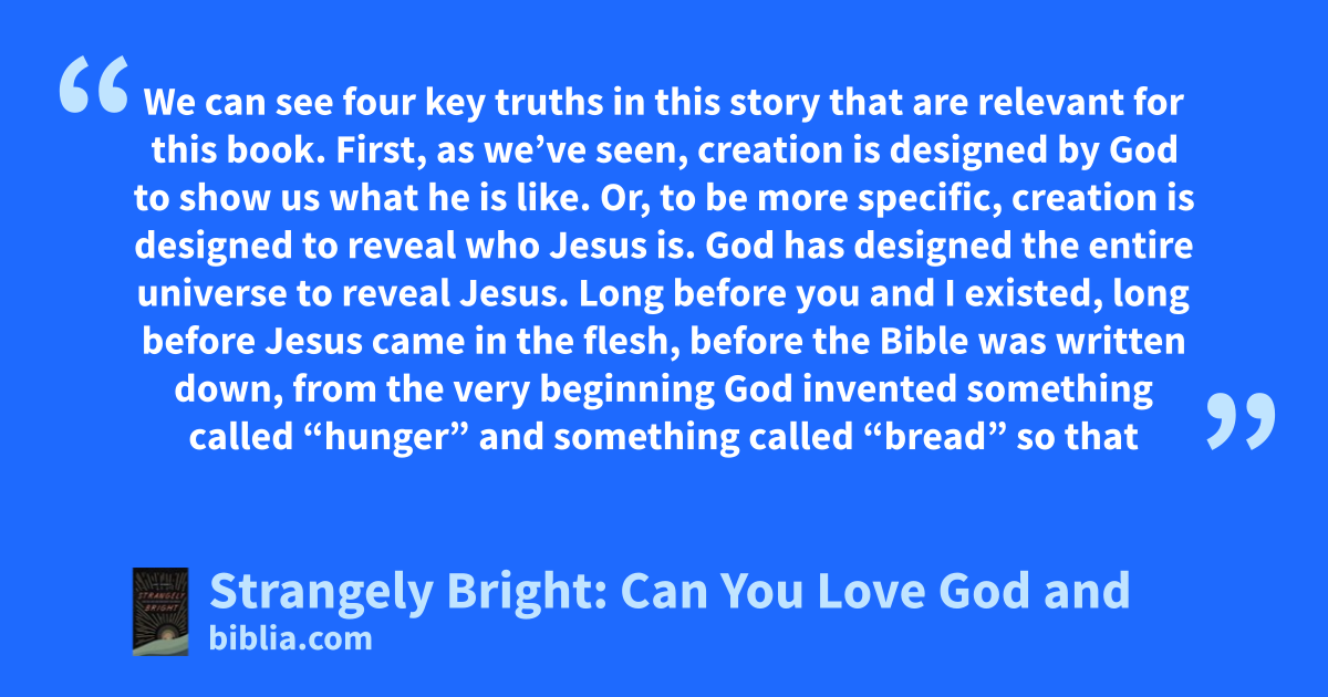 We can see four key truths in this story that are relevant for this book. First, as we’ve seen, creation is designed by God to show us what he is like. Or, to be more specific, creation is designed to reveal who Jesus is. God has designed the entire universe to reveal Jesus. Long before you and I existed, long before Jesus came in the flesh, before the Bible was written down, from the very beginning God invented something called “hunger” and something called “bread” so that