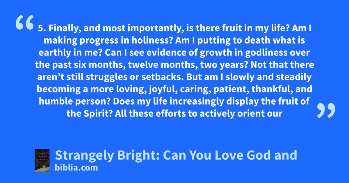 5. Finally, and most importantly, is there fruit in my life? Am I making progress in holiness? Am I putting to death what is earthly in me? Can I see evidence of growth in godliness over the past six months, twelve months, two years? Not that there aren’t still struggles or setbacks. But am I slowly and steadily becoming a more loving, joyful, caring, patient, thankful, and humble person? Does my life increasingly display the fruit of the Spirit? All these efforts to actively orient our