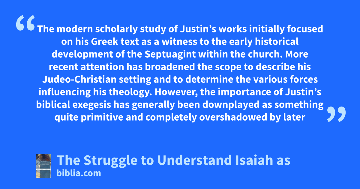 The modern scholarly study of Justin’s works initially focused on his Greek text as a witness to the early historical development of the Septuagint within the church. More recent attention has broadened the scope to describe his Judeo-Christian setting and to determine the various forces influencing his theology. However, the importance of Justin’s biblical exegesis has generally been downplayed as something quite primitive and completely overshadowed by later