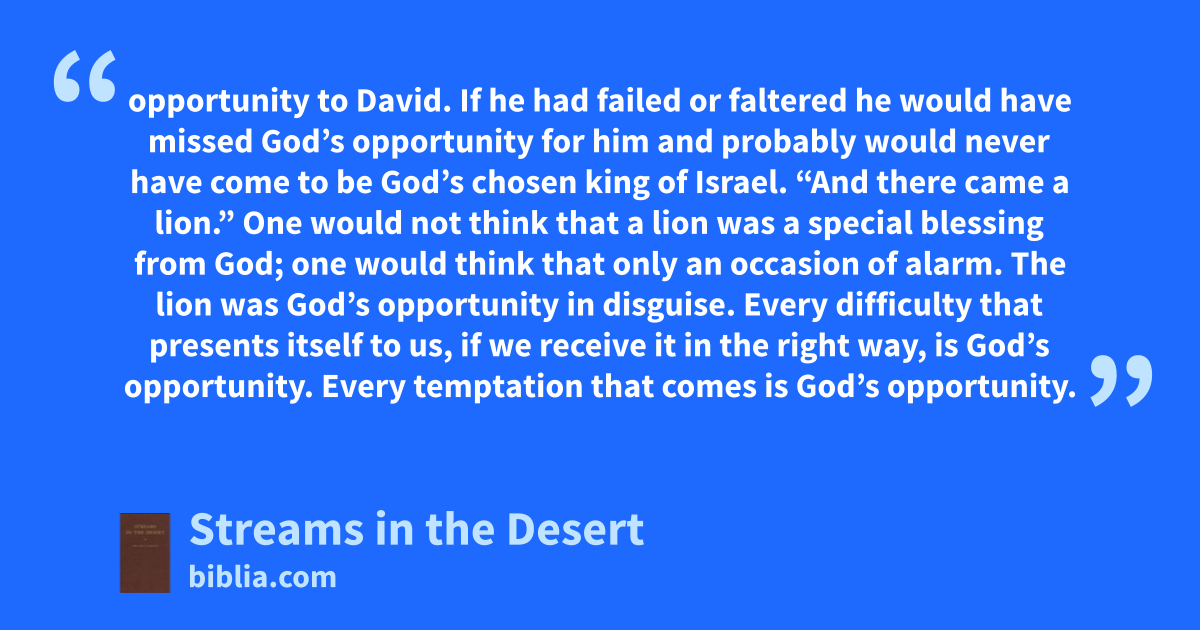 opportunity to David. If he had failed or faltered he would have missed God’s opportunity for him and probably would never have come to be God’s chosen king of Israel. “And there came a lion.” One would not think that a lion was a special blessing from God; one would think that only an occasion of alarm. The lion was God’s opportunity in disguise. Every difficulty that presents itself to us, if we receive it in the right way, is God’s opportunity. Every temptation that comes is God’s opportunity.