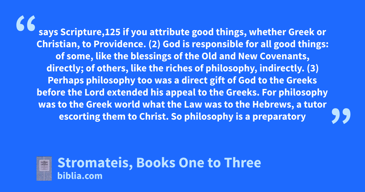 says Scripture,125 if you attribute good things, whether Greek or Christian, to Providence. (2) God is responsible for all good things: of some, like the blessings of the Old and New Covenants, directly; of others, like the riches of philosophy, indirectly. (3) Perhaps philosophy too was a direct gift of God to the Greeks before the Lord extended his appeal to the Greeks. For philosophy was to the Greek world what the Law was to the Hebrews, a tutor escorting them to Christ. So philosophy is a preparatory