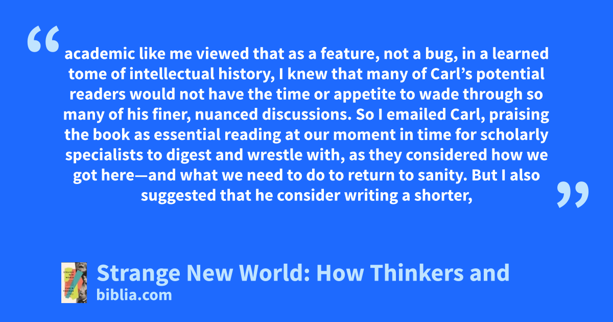academic like me viewed that as a feature, not a bug, in a learned tome of intellectual history, I knew that many of Carl’s potential readers would not have the time or appetite to wade through so many of his finer, nuanced discussions. So I emailed Carl, praising the book as essential reading at our moment in time for scholarly specialists to digest and wrestle with, as they considered how we got here—and what we need to do to return to sanity. But I also suggested that he consider writing a shorter,