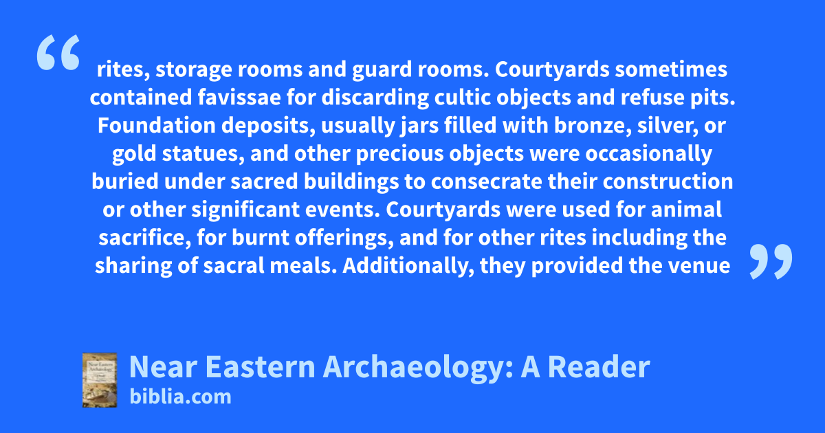 rites, storage rooms and guard rooms. Courtyards sometimes contained favissae for discarding cultic objects and refuse pits. Foundation deposits, usually jars filled with bronze, silver, or gold statues, and other precious objects were occasionally buried under sacred buildings to consecrate their construction or other significant events. Courtyards were used for animal sacrifice, for burnt offerings, and for other rites including the sharing of sacral meals. Additionally, they provided the venue