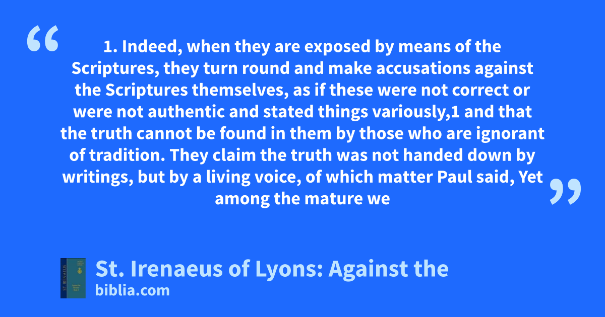 1. Indeed, when they are exposed by means of the Scriptures, they turn round and make accusations against the Scriptures themselves, as if these were not correct or were not authentic and stated things variously,1 and that the truth cannot be found in them by those who are ignorant of tradition. They claim the truth was not handed down by writings, but by a living voice, of which matter Paul said, Yet among the mature we