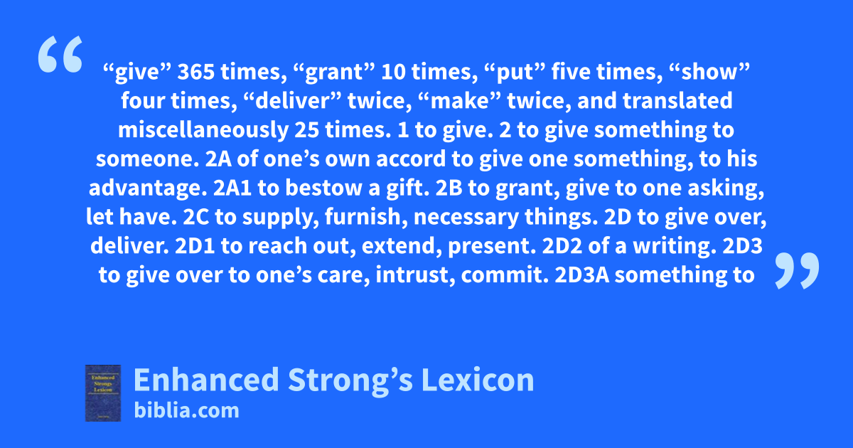 “give” 365 times, “grant” 10 times, “put” five times, “show” four times, “deliver” twice, “make” twice, and translated miscellaneously 25 times. 1 to give. 2 to give something to someone. 2A of one’s own accord to give one something, to his advantage. 2A1 to bestow a gift. 2B to grant, give to one asking, let have. 2C to supply, furnish, necessary things. 2D to give over, deliver. 2D1 to reach out, extend, present. 2D2 of a writing. 2D3 to give over to one’s care, intrust, commit. 2D3A something to
