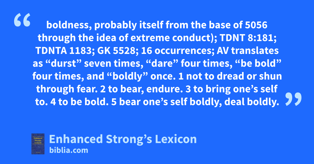 boldness, probably itself from the base of 5056 through the idea of extreme conduct); TDNT 8:181; TDNTA 1183; GK 5528; 16 occurrences; AV translates as “durst” seven times, “dare” four times, “be bold” four times, and “boldly” once. 1 not to dread or shun through fear. 2 to bear, endure. 3 to bring one’s self to. 4 to be bold. 5 bear one’s self boldly, deal boldly.