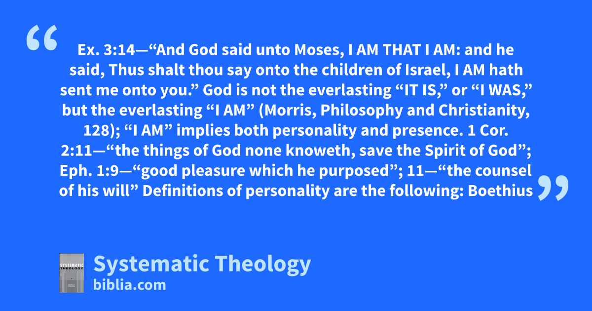 Ex. 3:14—“And God said unto Moses, I am that I am: and he said, Thus shalt thou say onto the children of Israel, I am hath sent me onto you.” God is not the everlasting “It is,” or “I was,” but the everlasting “I am” (Morris, Philosophy and Christianity, 128); “I am” implies both personality and presence. 1 Cor. 2:11—“the things of God none knoweth, save the Spirit of God”; Eph. 1:9—“good pleasure which he purposed”; 11—“the counsel of his will” Definitions of personality are the following: Boethius—“Persona est animæ rationalis individua substantia” (quoted in Dorner, Glaubenslehre, 2:415). F. W. Robertson, Genesis 3—“Personality = self-consciousness, will, character.” Porter, Human Intellect, 626—“Distinct subsistence, either actually or latently self-conscious and self-determining.” Harris, Philos. Basis of Theism: Person =“being, conscious of self, subsisting in individuality and identity, and endowed with intuitive reason, rational sensibility, and free-will.” See Harris, 98, 99, quotation from Mansel—“The freedom of the will is so far from being, as it is generally considered, a controvertible question in philosophy, that it is the fundamental postulate without which all action and all speculation, philosophy in all its branches and human consciousness itself, would be impossible.”