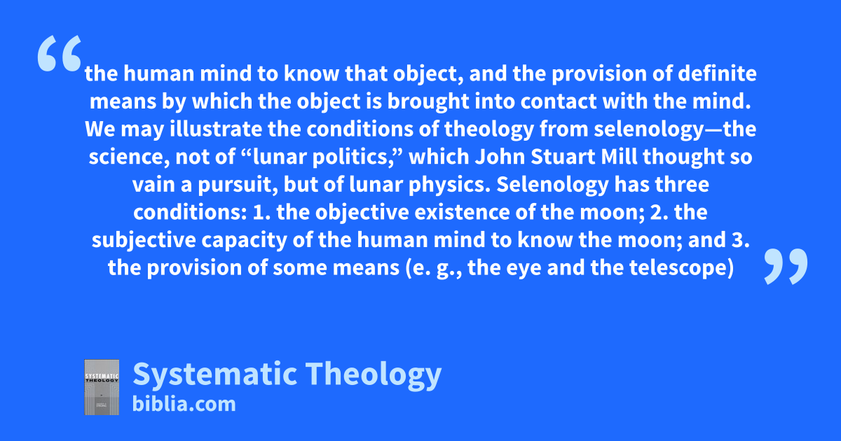 Any particular science is possible only when three conditions combine, namely, the actual existence of the object with which the science deals, the subjective capacity of the human mind to know that object, and the provision of definite means by which the object is brought into contact with the mind. We may illustrate the conditions of theology from selenology—the science, not of “lunar politics,” which John Stuart Mill thought so vain a pursuit, but of lunar physics. Selenology has three conditions: 1. the objective existence of the moon; 2. the subjective capacity of the human mind to know the moon; and 3. the provision of some means (e. g., the eye and the telescope) by which the gulf between man and the moon is bridged over, and by which the mind can come into actual cognizance of the facts with regard to the moon.