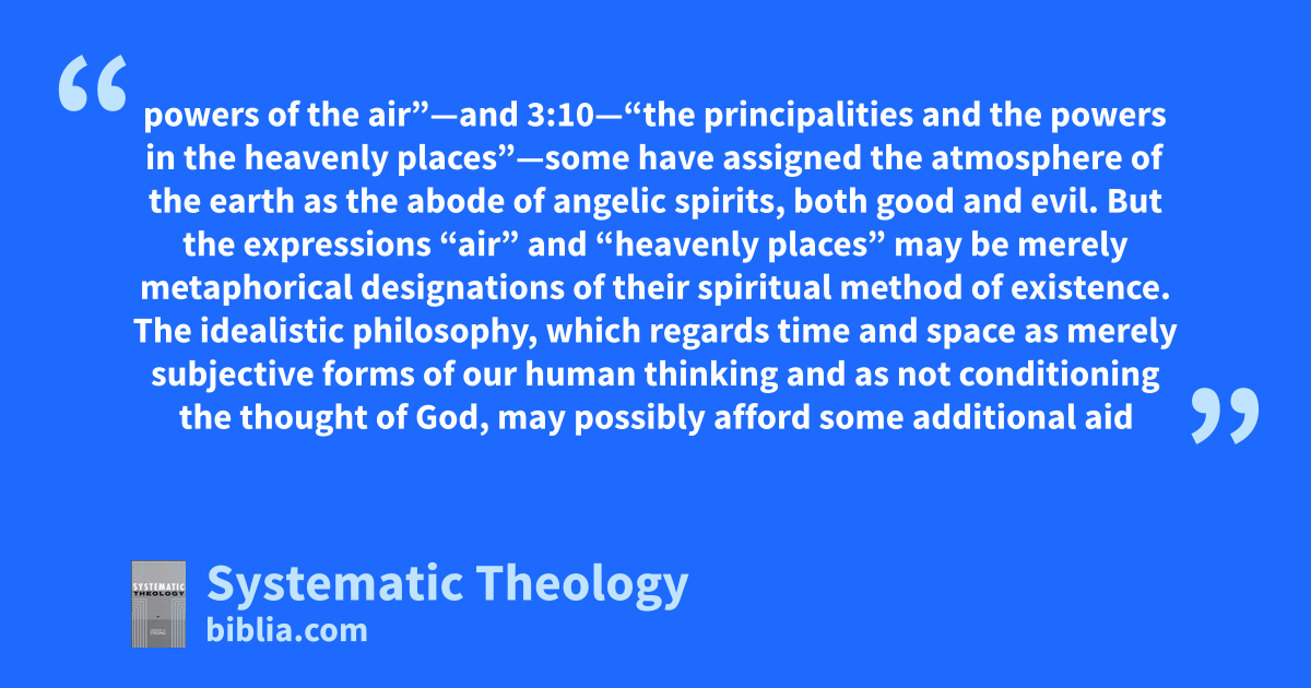 We prefer therefore to leave the question of place undecided, and to accept the existence and working of angels both good and evil as a matter of faith, without professing to understand their relations to space. For the rationalistic view, see Strauss, Glaubenslehre, 1:670–675. Per contra, see Van Oosterzee, Christian Dogmatics, 1:308–317; Martensen, Christian Dogmatics, 127–136.