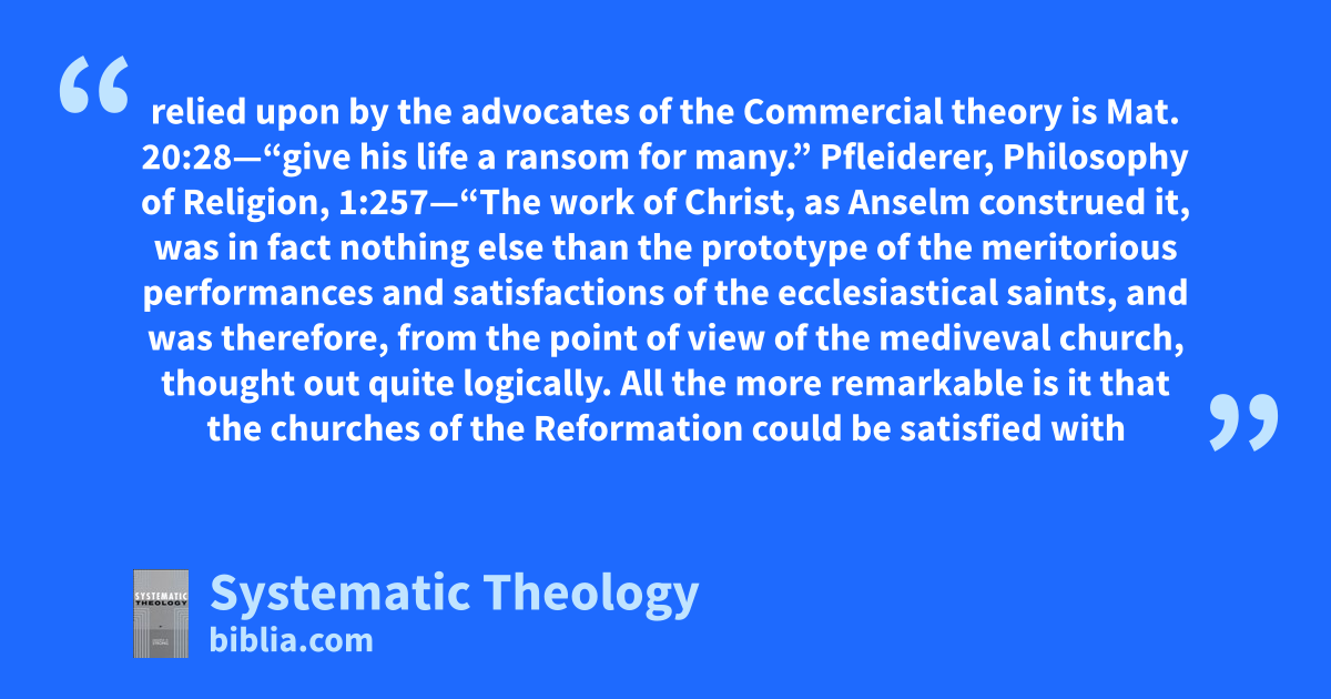 Milton, Paradise Lost, 3:209–212—“Die he, or justice must, unless for him Some other, able and as willing, pay The rigid satisfaction, death for death.” The main text relied upon by the advocates of the Commercial theory is Mat. 20:28—“give his life a ransom for many.” Pfleiderer, Philosophy of Religion, 1:257—“The work of Christ, as Anselm construed it, was in fact nothing else than the prototype of the meritorious performances and satisfactions of the ecclesiastical saints, and was therefore, from the point of view of the mediveval church, thought out quite logically. All the more remarkable is it that the churches of the Reformation could be satisfied with this theory, notwithstanding that it stood in complete contradiction to their deeper moral consciousness. If, according to Protestant principles generally, there are no supererogatory meritorious works, then one would suppose that such cannot be accepted even in the case of Jesus.”