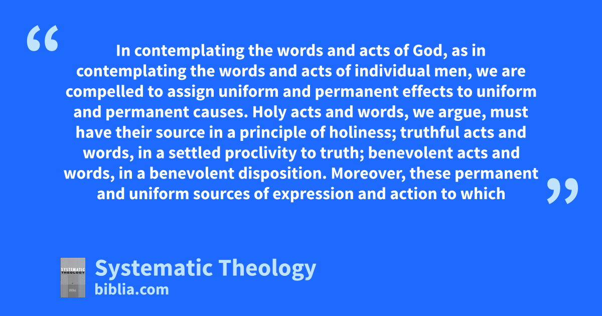 In contemplating the words and acts of God, as in contemplating the words and acts of individual men, we are compelled to assign uniform and permanent effects to uniform and permanent causes. Holy acts and words, we argue, must have their source in a principle of holiness; truthful acts and words, in a settled proclivity to truth; benevolent acts and words, in a benevolent disposition.