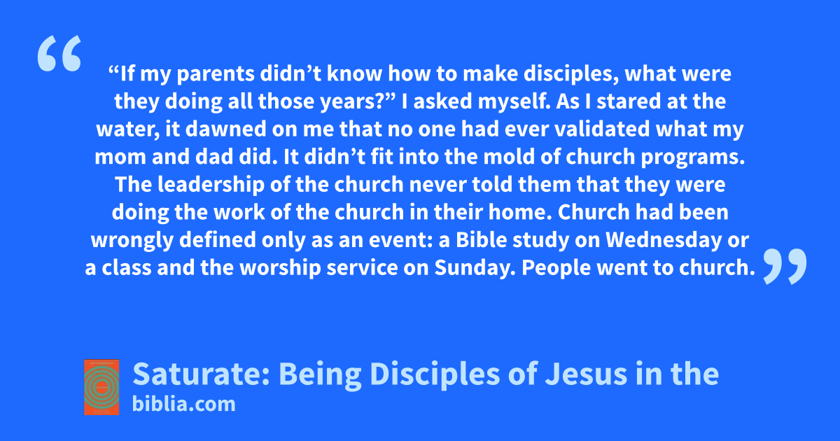 “If my parents didn’t know how to make disciples, what were they doing all those years?” I asked myself. As I stared at the water, it dawned on me that no one had ever validated what my mom and dad did. It didn’t fit into the mold of church programs. The leadership of the church never told them that they were doing the work of the church in their home. Church had been wrongly defined only as an event: a Bible study on Wednesday or a class and the worship service on Sunday. People went to church.