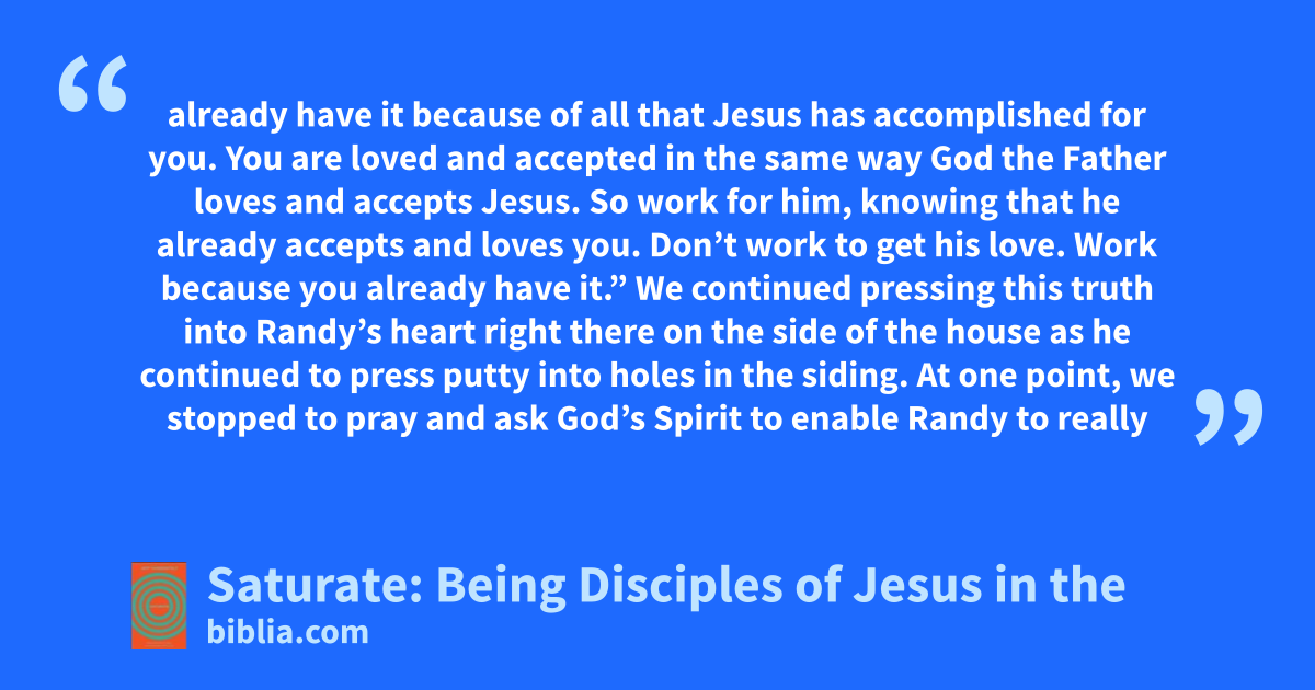 already have it because of all that Jesus has accomplished for you. You are loved and accepted in the same way God the Father loves and accepts Jesus. So work for him, knowing that he already accepts and loves you. Don’t work to get his love. Work because you already have it.” We continued pressing this truth into Randy’s heart right there on the side of the house as he continued to press putty into holes in the siding. At one point, we stopped to pray and ask God’s Spirit to enable Randy to really