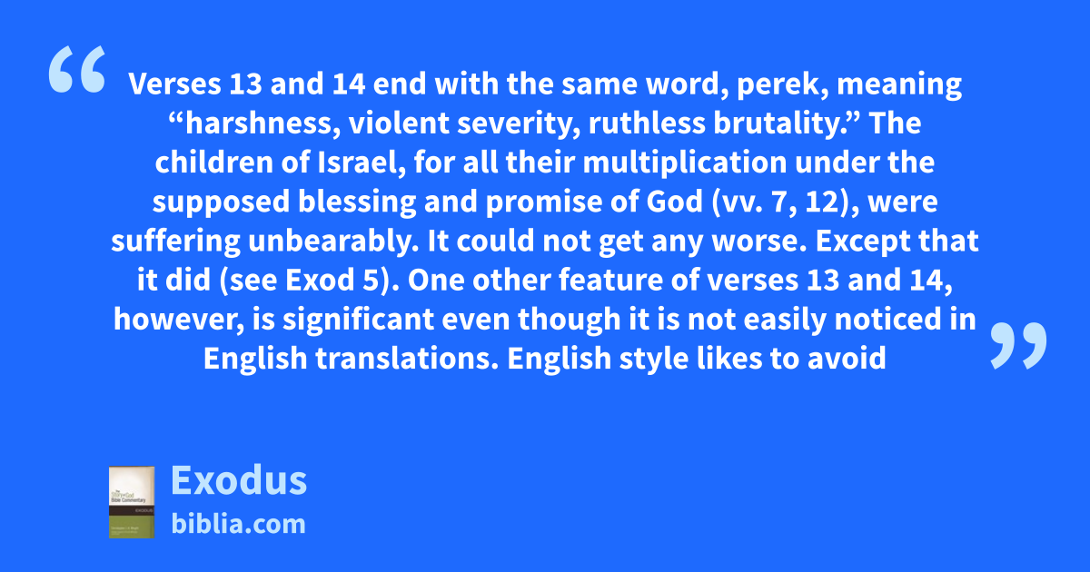 Verses 13 and 14 end with the same word, perek, meaning “harshness, violent severity, ruthless brutality.” The children of Israel, for all their multiplication under the supposed blessing and promise of God (vv. 7, 12), were suffering unbearably. It could not get any worse. Except that it did (see Exod 5). One other feature of verses 13 and 14, however, is significant even though it is not easily noticed in English translations. English style likes to avoid