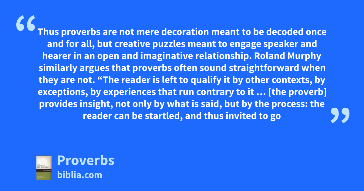 Thus proverbs are not mere decoration meant to be decoded once and for all, but creative puzzles meant to engage speaker and hearer in an open and imaginative relationship. Roland Murphy similarly argues that proverbs often sound straightforward when they are not. “The reader is left to qualify it by other contexts, by exceptions, by experiences that run contrary to it … [the proverb] provides insight, not only by what is said, but by the process: the reader can be startled, and thus invited to go