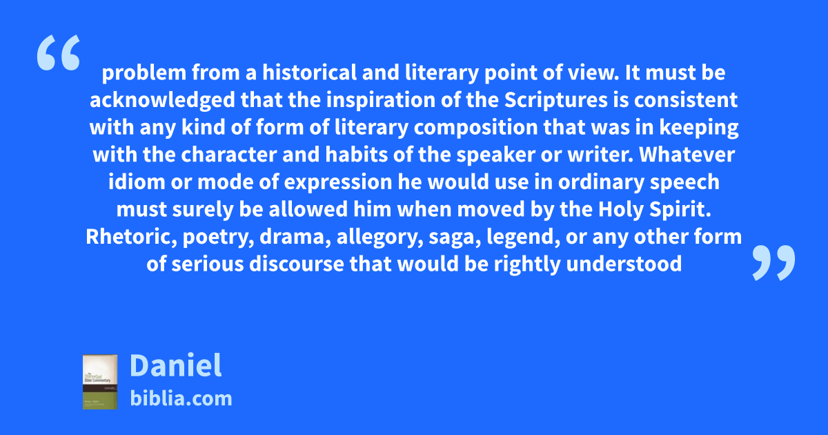 problem from a historical and literary point of view. It must be acknowledged that the inspiration of the Scriptures is consistent with any kind of form of literary composition that was in keeping with the character and habits of the speaker or writer. Whatever idiom or mode of expression he would use in ordinary speech must surely be allowed him when moved by the Holy Spirit. Rhetoric, poetry, drama, allegory, saga, legend, or any other form of serious discourse that would be rightly understood