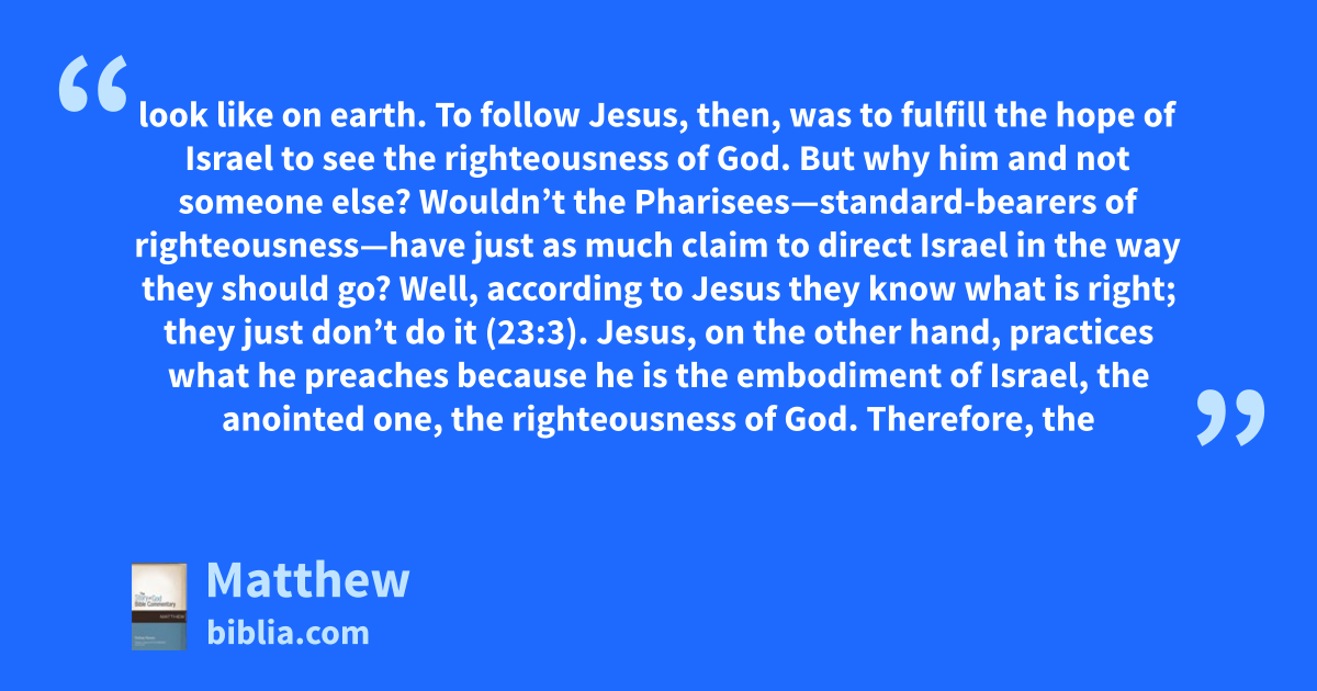 look like on earth. To follow Jesus, then, was to fulfill the hope of Israel to see the righteousness of God. But why him and not someone else? Wouldn’t the Pharisees—standard-bearers of righteousness—have just as much claim to direct Israel in the way they should go? Well, according to Jesus they know what is right; they just don’t do it (23:3). Jesus, on the other hand, practices what he preaches because he is the embodiment of Israel, the anointed one, the righteousness of God. Therefore, the