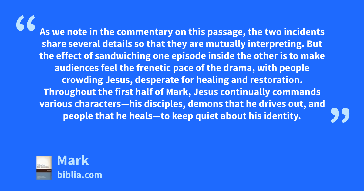 As we note in the commentary on this passage, the two incidents share several details so that they are mutually interpreting. But the effect of sandwiching one episode inside the other is to make audiences feel the frenetic pace of the drama, with people crowding Jesus, desperate for healing and restoration. Throughout the first half of Mark, Jesus continually commands various characters—his disciples, demons that he drives out, and people that he heals—to keep quiet about his identity.
