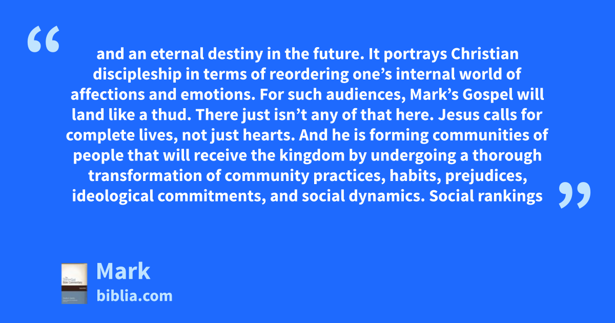 and an eternal destiny in the future. It portrays Christian discipleship in terms of reordering one’s internal world of affections and emotions. For such audiences, Mark’s Gospel will land like a thud. There just isn’t any of that here. Jesus calls for complete lives, not just hearts. And he is forming communities of people that will receive the kingdom by undergoing a thorough transformation of community practices, habits, prejudices, ideological commitments, and social dynamics. Social rankings