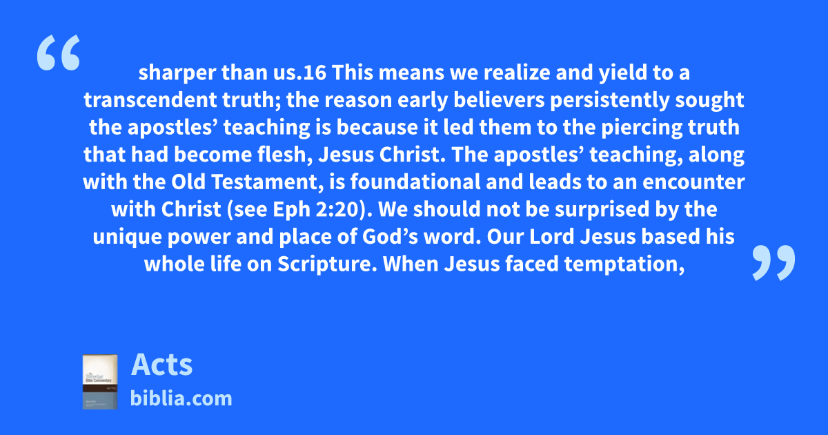 sharper than us.16 This means we realize and yield to a transcendent truth; the reason early believers persistently sought the apostles’ teaching is because it led them to the piercing truth that had become flesh, Jesus Christ. The apostles’ teaching, along with the Old Testament, is foundational and leads to an encounter with Christ (see Eph 2:20). We should not be surprised by the unique power and place of God’s word. Our Lord Jesus based his whole life on Scripture. When Jesus faced temptation,