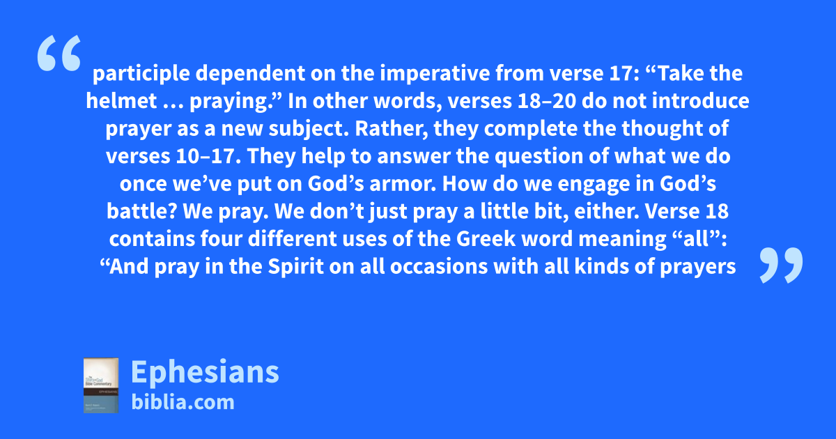 participle dependent on the imperative from verse 17: “Take the helmet … praying.” In other words, verses 18–20 do not introduce prayer as a new subject. Rather, they complete the thought of verses 10–17. They help to answer the question of what we do once we’ve put on God’s armor. How do we engage in God’s battle? We pray. We don’t just pray a little bit, either. Verse 18 contains four different uses of the Greek word meaning “all”: “And pray in the Spirit on all occasions with all kinds of prayers