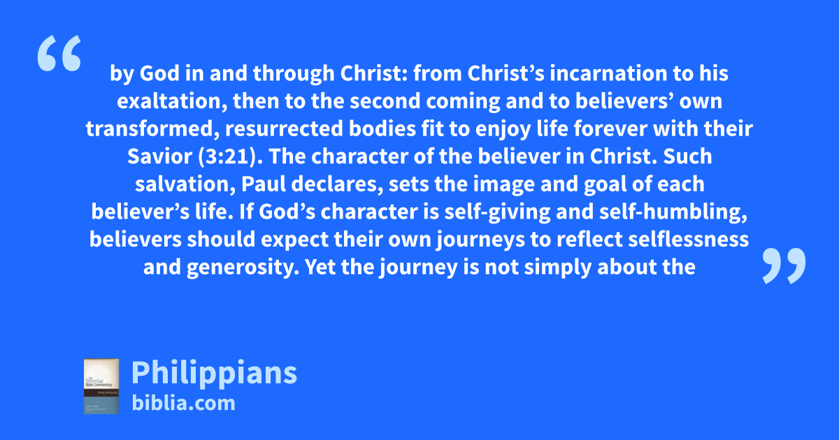 by God in and through Christ: from Christ’s incarnation to his exaltation, then to the second coming and to believers’ own transformed, resurrected bodies fit to enjoy life forever with their Savior (3:21). The character of the believer in Christ. Such salvation, Paul declares, sets the image and goal of each believer’s life. If God’s character is self-giving and self-humbling, believers should expect their own journeys to reflect selflessness and generosity. Yet the journey is not simply about the