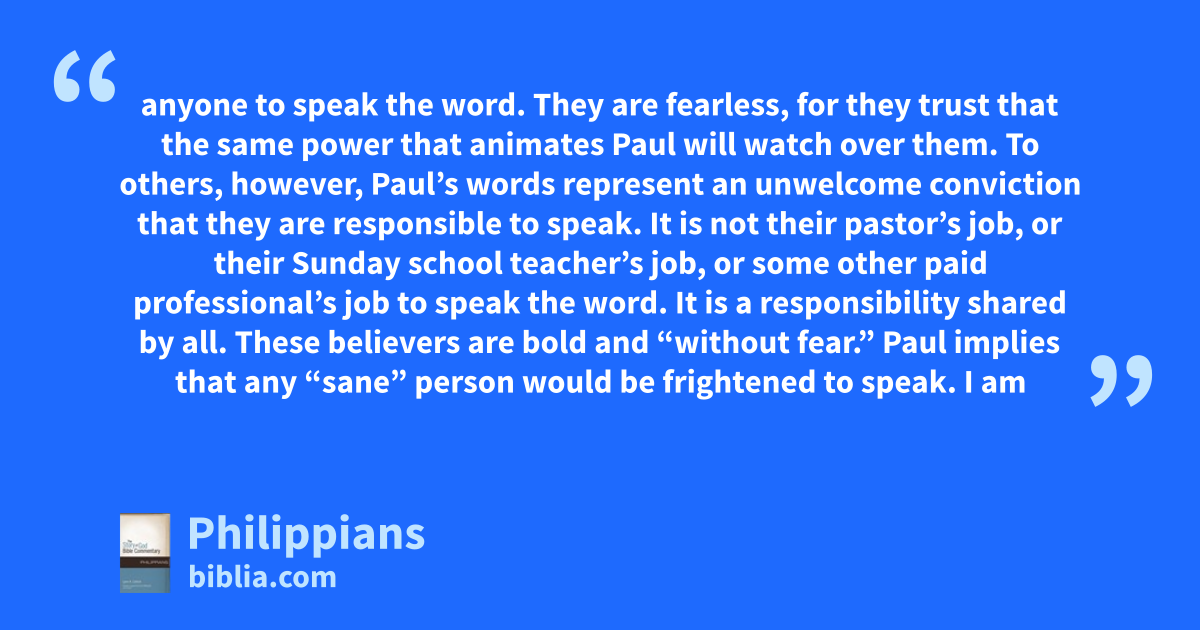 anyone to speak the word. They are fearless, for they trust that the same power that animates Paul will watch over them. To others, however, Paul’s words represent an unwelcome conviction that they are responsible to speak. It is not their pastor’s job, or their Sunday school teacher’s job, or some other paid professional’s job to speak the word. It is a responsibility shared by all. These believers are bold and “without fear.” Paul implies that any “sane” person would be frightened to speak. I am