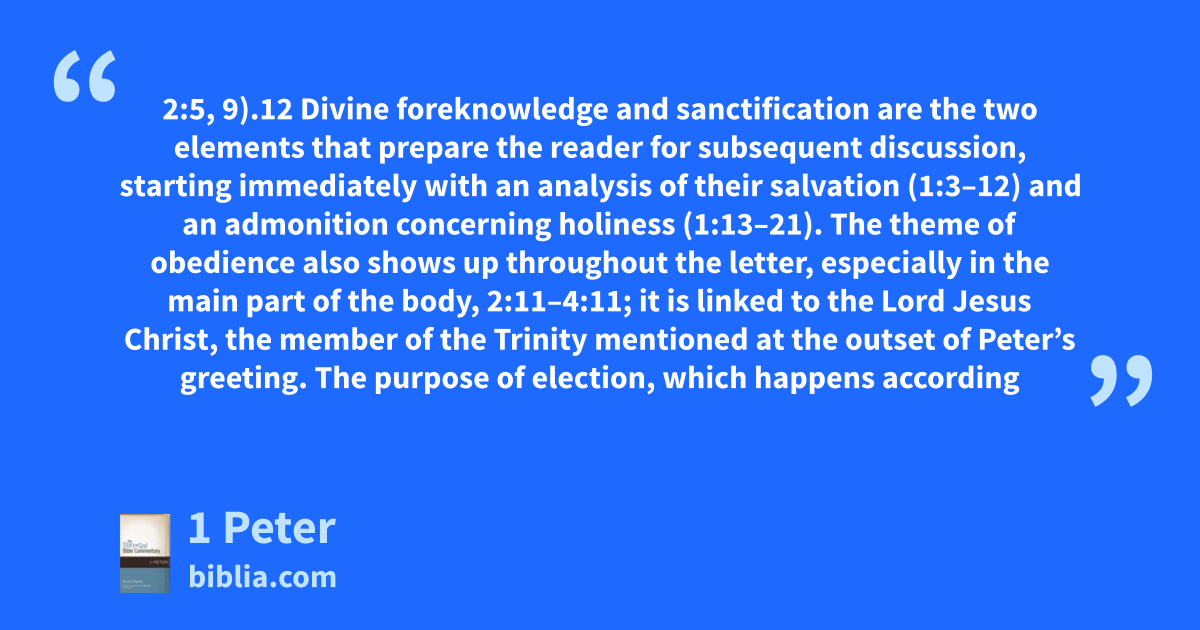 2:5, 9).12 Divine foreknowledge and sanctification are the two elements that prepare the reader for subsequent discussion, starting immediately with an analysis of their salvation (1:3–12) and an admonition concerning holiness (1:13–21). The theme of obedience also shows up throughout the letter, especially in the main part of the body, 2:11–4:11; it is linked to the Lord Jesus Christ, the member of the Trinity mentioned at the outset of Peter’s greeting. The purpose of election, which happens according