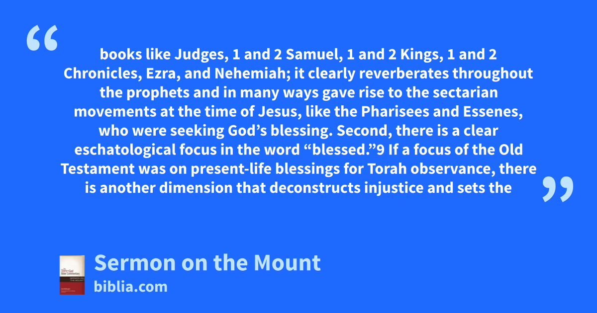 books like Judges, 1 and 2 Samuel, 1 and 2 Kings, 1 and 2 Chronicles, Ezra, and Nehemiah; it clearly reverberates throughout the prophets and in many ways gave rise to the sectarian movements at the time of Jesus, like the Pharisees and Essenes, who were seeking God’s blessing. Second, there is a clear eschatological focus in the word “blessed.”9 If a focus of the Old Testament was on present-life blessings for Torah observance, there is another dimension that deconstructs injustice and sets the
