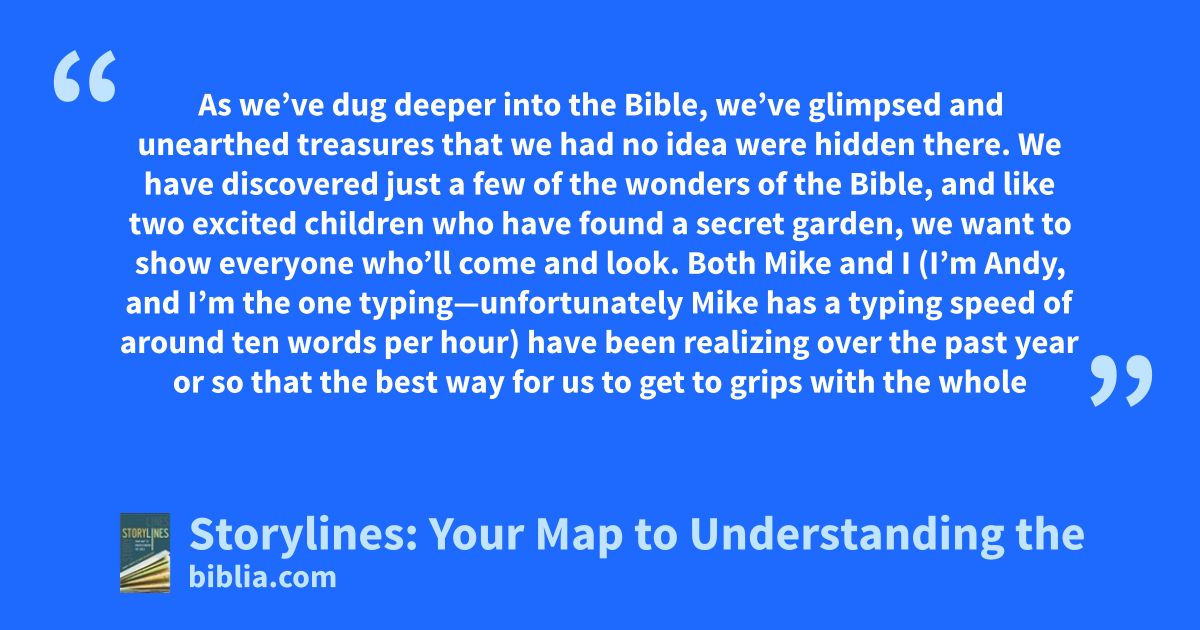 As we’ve dug deeper into the Bible, we’ve glimpsed and unearthed treasures that we had no idea were hidden there. We have discovered just a few of the wonders of the Bible, and like two excited children who have found a secret garden, we want to show everyone who’ll come and look. Both Mike and I (I’m Andy, and I’m the one typing—unfortunately Mike has a typing speed of around ten words per hour) have been realizing over the past year or so that the best way for us to get to grips with the whole