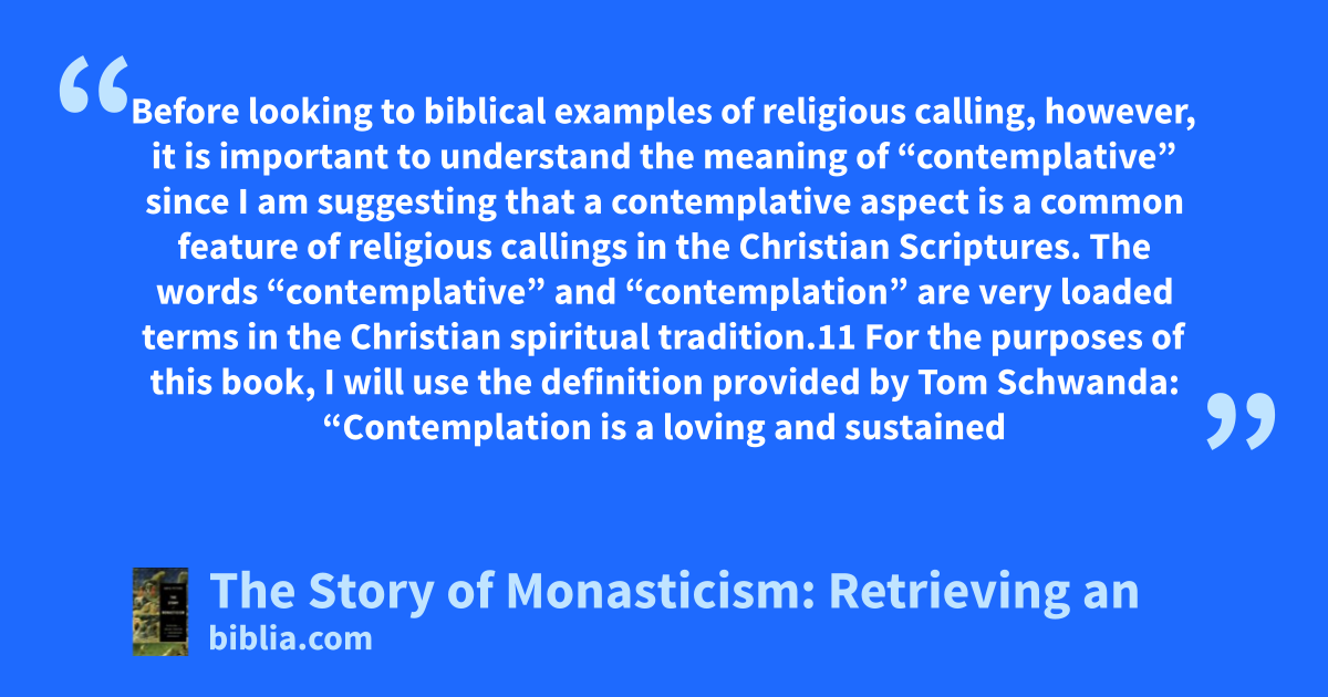 Before looking to biblical examples of religious calling, however, it is important to understand the meaning of “contemplative” since I am suggesting that a contemplative aspect is a common feature of religious callings in the Christian Scriptures. The words “contemplative” and “contemplation” are very loaded terms in the Christian spiritual tradition.11 For the purposes of this book, I will use the definition provided by Tom Schwanda: “Contemplation is a loving and sustained
