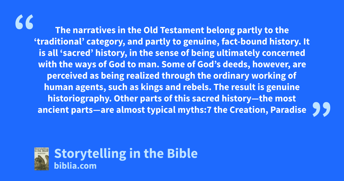 The narratives in the Old Testament belong partly to the ‘traditional’ category, and partly to genuine, fact-bound history. It is all ‘sacred’ history, in the sense of being ultimately concerned with the ways of God to man. Some of God’s deeds, however, are perceived as being realized through the ordinary working of human agents, such as kings and rebels. The result is genuine historiography. Other parts of this sacred history—the most ancient parts—are almost typical myths:7 the Creation, Paradise