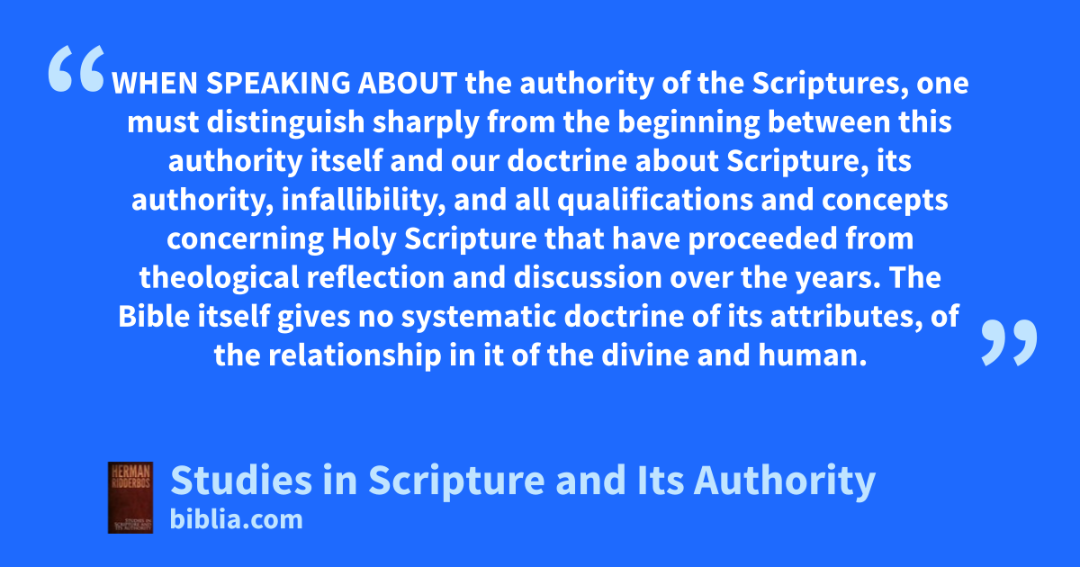 WHEN SPEAKING ABOUT the authority of the Scriptures, one must distinguish sharply from the beginning between this authority itself and our doctrine about Scripture, its authority, infallibility, and all qualifications and concepts concerning Holy Scripture that have proceeded from theological reflection and discussion over the years. The Bible itself gives no systematic doctrine of its attributes, of the relationship in it of the divine and human.