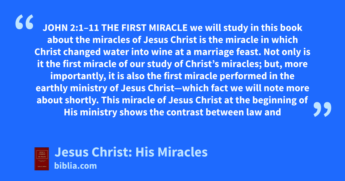 JOHN 2:1–11 THE FIRST MIRACLE we will study in this book about the miracles of Jesus Christ is the miracle in which Christ changed water into wine at a marriage feast. Not only is it the first miracle of our study of Christ’s miracles; but, more importantly, it is also the first miracle performed in the earthly ministry of Jesus Christ—which fact we will note more about shortly. This miracle of Jesus Christ at the beginning of His ministry shows the contrast between law and