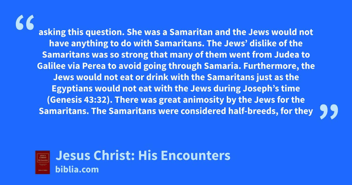 asking this question. She was a Samaritan and the Jews would not have anything to do with Samaritans. The Jews’ dislike of the Samaritans was so strong that many of them went from Judea to Galilee via Perea to avoid going through Samaria. Furthermore, the Jews would not eat or drink with the Samaritans just as the Egyptians would not eat with the Jews during Joseph’s time (Genesis 43:32). There was great animosity by the Jews for the Samaritans. The Samaritans were considered half-breeds, for they