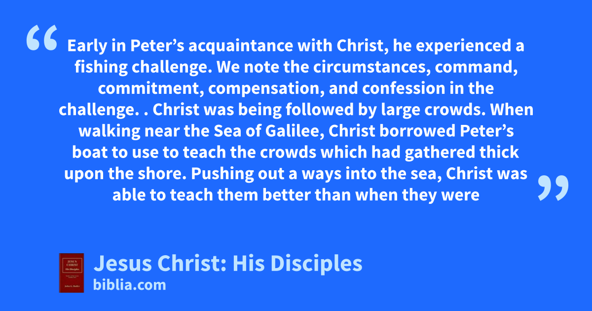 Early in Peter’s acquaintance with Christ, he experienced a fishing challenge. We note the circumstances, command, commitment, compensation, and confession in the challenge. . Christ was being followed by large crowds. When walking near the Sea of Galilee, Christ borrowed Peter’s boat to use to teach the crowds which had gathered thick upon the shore. Pushing out a ways into the sea, Christ was able to teach them better than when they were