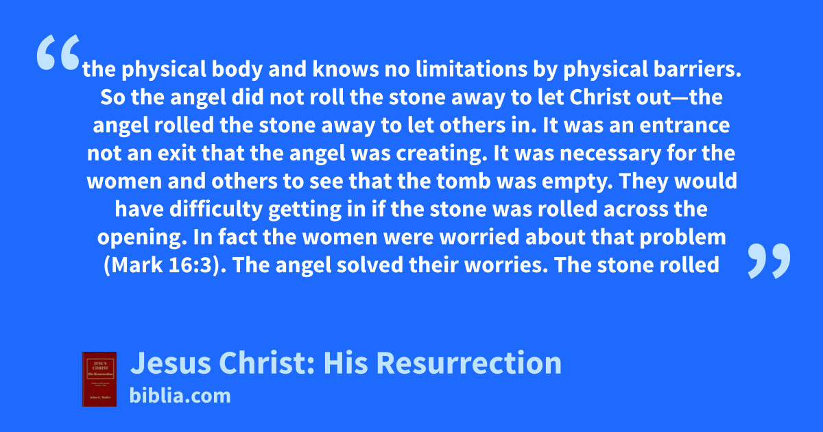 the physical body and knows no limitations by physical barriers. So the angel did not roll the stone away to let Christ out—the angel rolled the stone away to let others in. It was an entrance not an exit that the angel was creating. It was necessary for the women and others to see that the tomb was empty. They would have difficulty getting in if the stone was rolled across the opening. In fact the women were worried about that problem (Mark 16:3). The angel solved their worries. The stone rolled