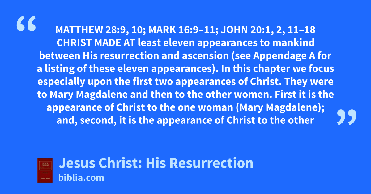 MATTHEW 28:9, 10; MARK 16:9–11; JOHN 20:1, 2, 11–18 CHRIST MADE AT least eleven appearances to mankind between His resurrection and ascension (see Appendage A for a listing of these eleven appearances). In this chapter we focus especially upon the first two appearances of Christ. They were to Mary Magdalene and then to the other women. First it is the appearance of Christ to the one woman (Mary Magdalene); and, second, it is the appearance of Christ to the other
