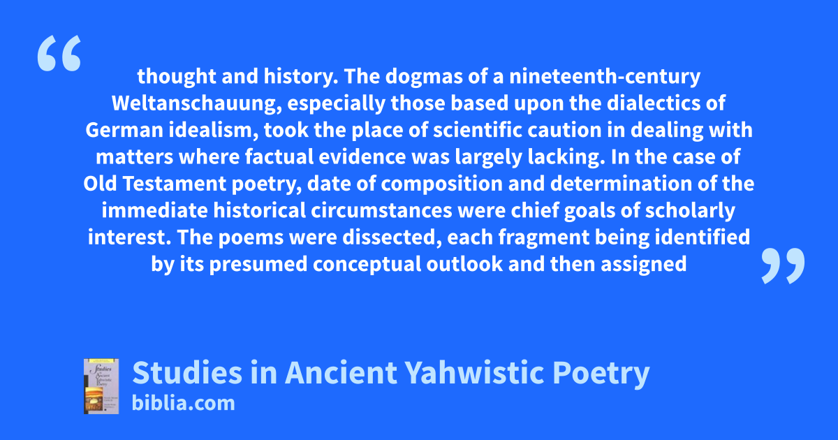 thought and history. The dogmas of a nineteenth-century Weltanschauung, especially those based upon the dialectics of German idealism, took the place of scientific caution in dealing with matters where factual evidence was largely lacking. In the case of Old Testament poetry, date of composition and determination of the immediate historical circumstances were chief goals of scholarly interest. The poems were dissected, each fragment being identified by its presumed conceptual outlook and then assigned